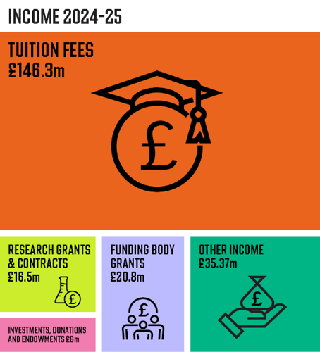 This relates to money spent on providing student support services including, for example, the grant to support the Students’ Union, sports facilities, the careers service, health centre and bus service. This also relates to money spent on scholarships and bursaries awarded to students across the University. Examples of recruitment costs are the running of applicant visit days and the employment of the student admissions team.