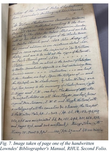 However, to further complicate this, the Royal Holloway Second Folio contains a handwritten note citing Lowndes' Bibliographer's Manual (Fig. 8. which I have transcribed): "Title- on which is the portrait of Shakespeare by Martin Droeschout." This runs contrary to the folio's present state, naturally leading us to question: did the annotator see the folio in its earlier state with the portrait, or was this a misinformed assumption, given their knowledge of Second Folios? If the annotations within are attributed to the Society, they imply that Droeshout’s original portrait was once present. This suggests the substitution occurred either before the Society’s acquisition or during its custody, potentially involving multiple individuals rather than Furnivall alone.