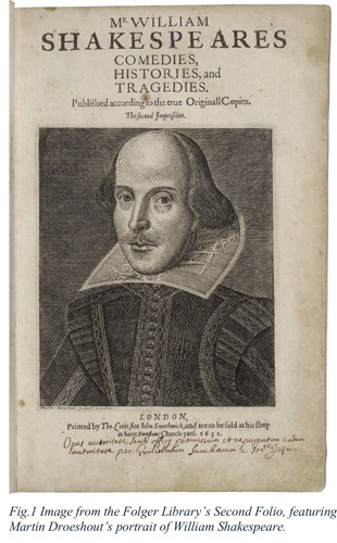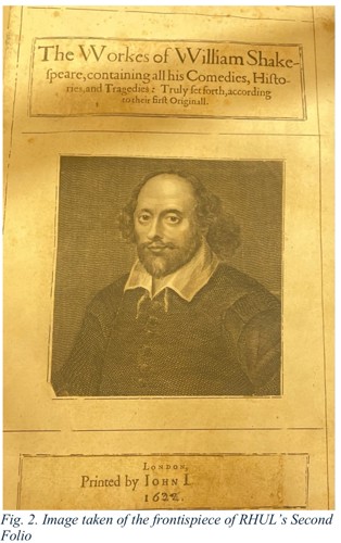The Second Folio, published in 1632, retained Droeshout's portrait. However, the copy from Royal Holloway broke apart from the lot. Instead of Droeshout's engraving, there is a substitute portrait, clearly altered after the book's initial printing.