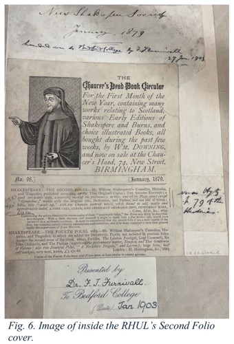 The Royal Holloway Second Folio entered the Bedford Collage Archive in 1903 (shown in Fig. 6.), gifted by the esteemed Frederick James Furnivall. If one doesn’t know already, Furnivall's input to English literary studies was enormous. He founded a series of scholarly and philological societies: the Early English Text Society (1864), the Chaucer Society (1868), the Ballad Society (1868), the New Shakespeare Society(1873), the Browning Society (1881, with Emily Hickey), the Wyclif Society (1882), and the Shelley Society (1885), while also contributing to the protracted genesis of the Oxford English Dictionary.