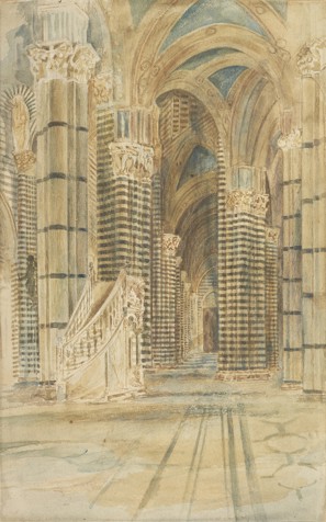 Two works in the Royal Holloway collection were of particular interest for the exhibition – watercolours of Siena Cathedral showing Pisano’s pulpit, painted by the artist and collector Christiana Herringham. Herringham, who painted in the late nineteenth century, was particularly interested in Italian art, and avidly documented what she saw on her travels, in tempera and watercolour. After her death, her husband donated her works to Bedford College, which then became part of the Royal Holloway collection after the merger in 1985.