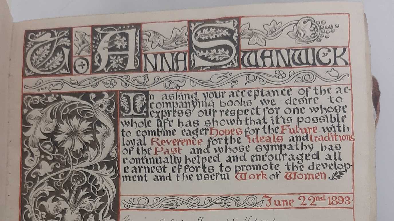 Dated 22 June 1893, this copy of The History of Troye was presented to Swanwick on her 80th birthday in 1893 alongside five additional volumes of other works, signed by 35 women].