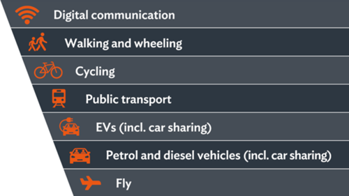 Whilst championing inclusivity, to do this it promotes a suite of travel incentives and measures that seek to reduce single occupancy vehicle use amongst students and staff in favour of more sustainable travel modes - all in line with our Environmental Policy’s travel hierarchy (below).