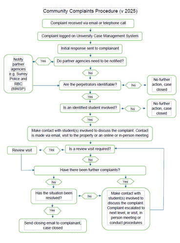 The university treats complaints about student conduct in the community very seriously and there is a process in place to monitor and respond to reported problems.