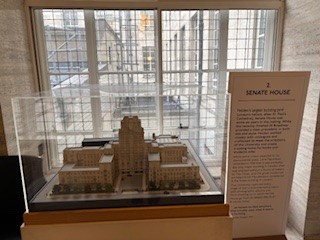 The tour was extremely interesting and nostalgic as I had personally spent many hours reading books and articles in the History library there and listening to History lectures in the large halls on the ground floor on Monday mornings. Angharad showed us parts of the library that I had not seen before, such as the ceremonial staircase, the stone recording the opening of the building by George V and Queen Mary, and the architect Charles Holden’s model of the building. We also learned that the original design included a ceremonial hall for graduation.