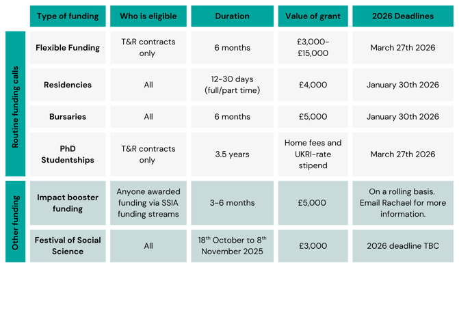The image below summarises the SSIA funding opportunities available to researchers at Royal Holloway. For more details about each funding stream and information on how to apply, please visit the relevant page linked below.
