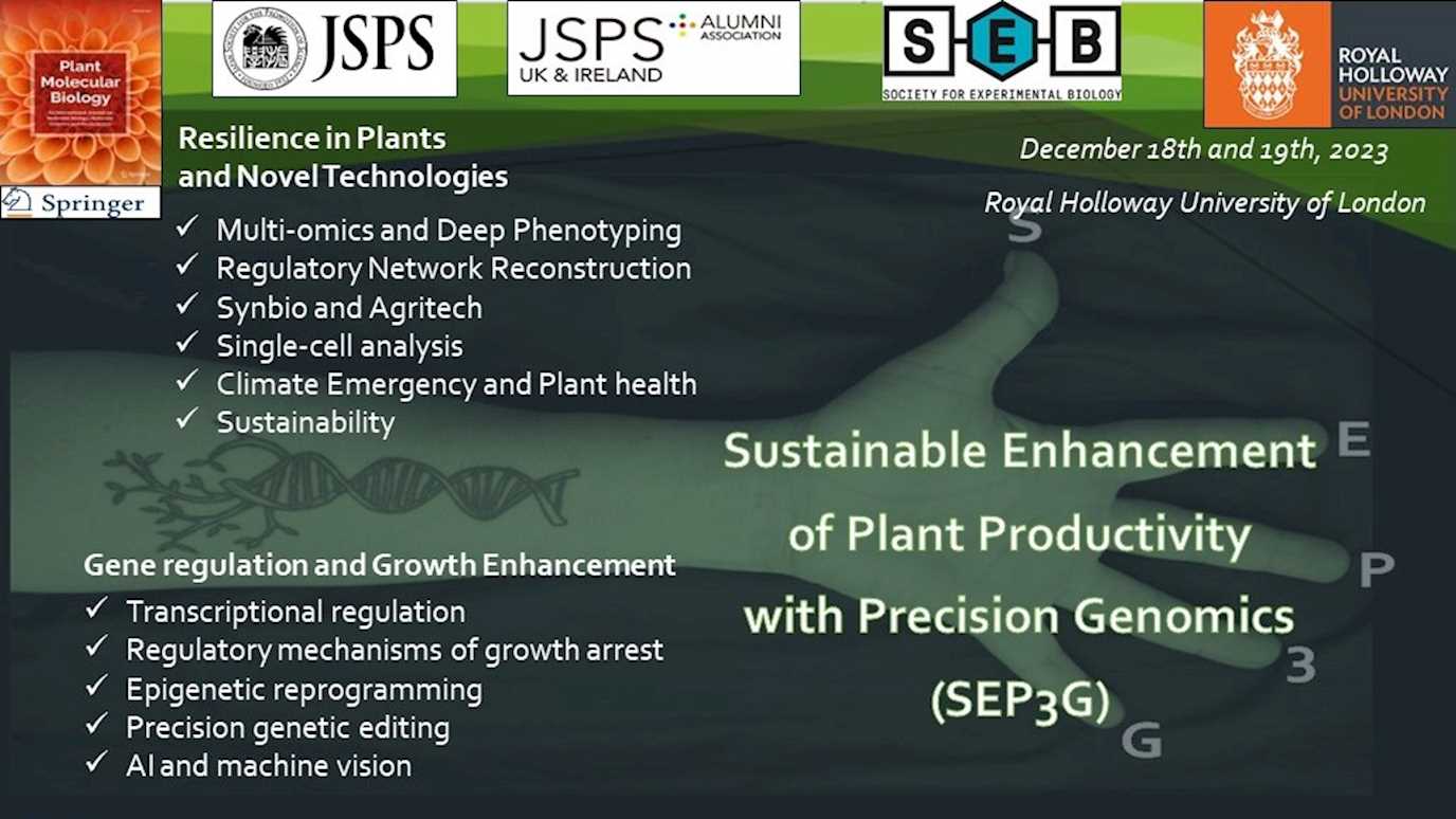 The purpose of the symposium on "Sustainable Enhancement of Plant Productivity with Precision Genomics" is to harness the power of cutting-edge genetic, genomics and biotechnology to improve the growth, yield, and overall sustainability of plant-based agriculture. The SEP3G symposium will serve as a critical platform joining academia and industry representatives with different, albeit complementary backgrounds and level of experience from UK, Europe and Japan, and it will be a catalyst for the exchange of ideas, collaboration, and the acceleration of scientific endeavours.