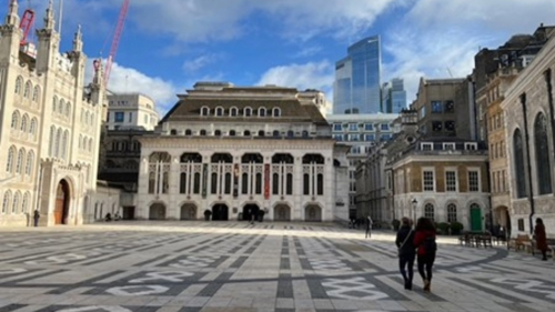 Looking across the square from the Guildhall building, the group learnt about the excavation inside the Guildhall Art Gallery where visitors can view and excavation of the remains of London's Roman Amphitheatre. The Guildhall Art Gallery houses the City of London art collection.