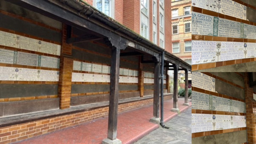 Anne-Marie introduced the Memorial to Heroic Self-Sacrifice, proposed and championed by the sculptor George Frederic Watts in 1887. Watts’ idea was championed by Henry Gamble, with the wooden loggia erected and opened incomplete in 1900, to mark the Golden Jubilee of Queen Victoria. The loggia was designed by Ernest George and has space for 120 ceramic memorial tiles that were originally designed by William De Morgan. Mary Watts, widow of George Frederic Watts, continued to oversee the project after her husband's passing, but lost interest later owing to the design of the ceramic tiles not fully meeting her expectations. There is lots more to read about this memorial in what is a quaint and peaceful former churchyard that still serves for workers in the City of London to take a quiet respite.