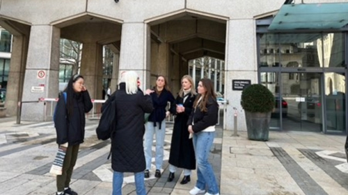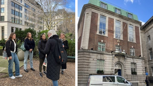 Battling against the stormy weather battering the UK at the time, plus the impediment caused by train strikes, students made their way to the meeting point outside the NERO café at St Paul's tube station. Able to identify fellow students by the Royal Holloway School of Business and Management cotton bags they all carried, they introduced themselves to each other eager for the tour to begin. The meeting site gave them an early introduction to the ongoing development that characterises the history of the City of London via the construction site visible in the photographs, and the meeting spot also allowed them to spot that iconic London vehicle – the London red bus!
