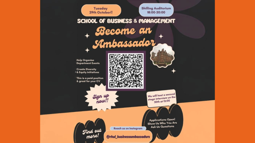 Open to all School of Business and Management students no matter which year of study you are in, whether you study Accounting and Finance or Business and Management, are a returning Year in Business placement student or are on a postgraduate course we want welcome your application. We want our Ambassadors to represent our entire community and student experience, so whether you live on campus or commute in, are a home student or an international one, come along to the recruitment evening to find out more and put your name forward.