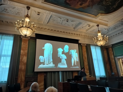 My own talk was about a fascinating statuary display discovered in the Hadrianic Baths at Aphrodisias — an ancient Greek city in modern south-west Türkiye, where I have been working since 2015. This statuary display involved a striking juxtaposition: on the one hand, a grand portrait statue of a late antique benefactor wearing a contemporary ‘power costume’ reserved for Roman governors; on the other, three mythological groups depicting figures and stories from the heroic past, including Achilles killing the Amazon queen Penthesileia. My core argument was that this juxtaposition would have been full of meaning and resonance for contemporary viewers in Late Antiquity. Those who saw the display were surely invited to compare the virtues and achievements of the benefactor honoured with the portrait statue to those of the great heroes of the mythological past.