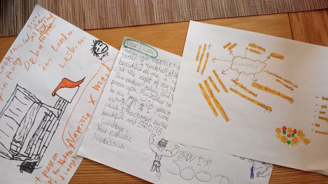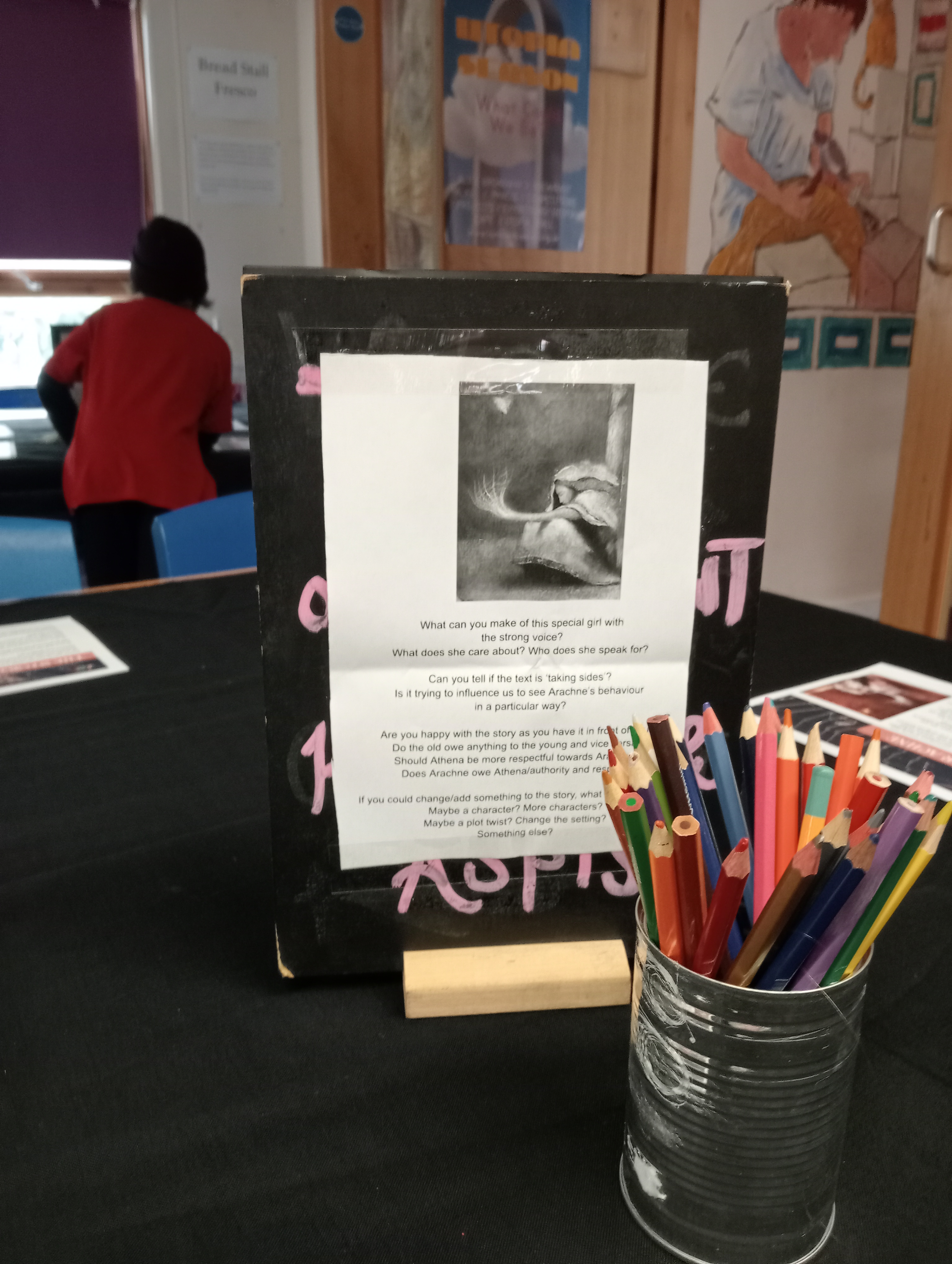 Myth and Voice had the pleasure to travel to Cheney School at East Oxford three times in June 2023 for a special collaboration with Dr Lorna Robinson, director of the Iris Project and the Rumble Community Museum housed at Cheney. Together we ran an after-school Myth and storytelling Café open to all of Cheney’s KS3 students and their friends, with no prior engagement to Classics needed or expected. The café was open on three consecutive Mondays. Each Monday we had a new myth: first came Eurydice and Orpheus, then Arachne and Goddess Minerva, and last but not least was Narcissus and Echo.