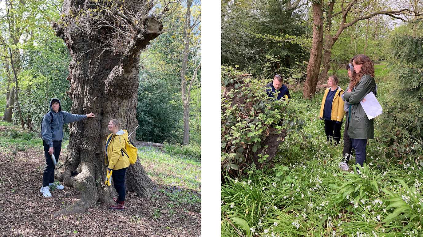 L: Measuring the Oak to gauge its age - at least 150 years old. Jessica Lingard-Nutt and Brandon Thompson.