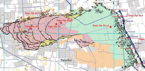 Structural map of the Petobo landslide, just east of Palu city. Irrigation canals are marked blue, landslide crown scarp and exhumed basal detachment are shown in green, the toe thrust system is shown in pink, and fluidised debris flows in brown. Light blue grid squares are 1 km wide.