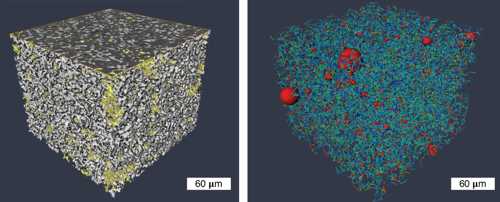 In the image reported here you can see the 3D volume rendering of a sample with 20 vol% of metal. Specifically, on the left the grey colour is interconnected metal, whereas yellow is unconnected. On the right side you see a ‘Pore Network Model’ of the same sample, where red spheres are large pools of metal and sticks are throats, coloured and scaled by their size (yellow larger radius throats to dark blue narrowest).