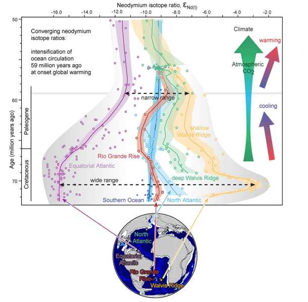 From 59 million years ago onwards, Nd-isotope signatures from the North and South Atlantic fell in a narrow range. This is interpreted to indicate that one deep-water mass, likely originating from the south, made its way through the Atlantic Ocean and filled the basin from deep to intermediate depths.