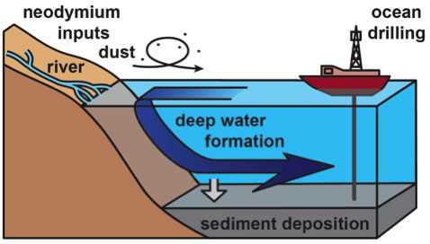 Schematic diagram showing how neodymium isotopes enter oceanic deep waters