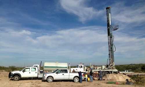 | Drilling to collect samples from a roll-front uranium deposit, Rosita, Texas. |