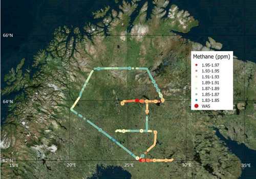 Measurements of methane mole fraction above Northern Fennoscandia showing elevations over wetlands on a FAAM campaign (Fisher et al., 2017)