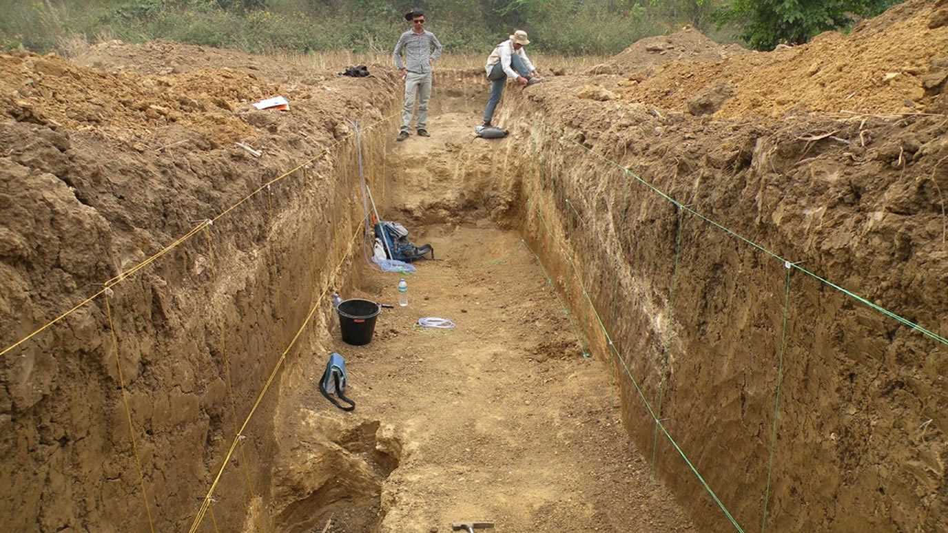 Paleoseismic trench across the hypothesised trace of a 1912 M7.7 earthquake in central Myanmar. The trench is located close to a 20 m high linear topographic scarp representing the Kyaukkyan Fault, and is along strike from an apparent 2 m deflection of a late 19th Century railway line to Mandalay. AMS-14C dating constrains a rupture exposed on the trench walls to less than 1270 ± 30 years BP, meaning the Kyaukkyan Fault may have been the origin of the 1912 earthquake.