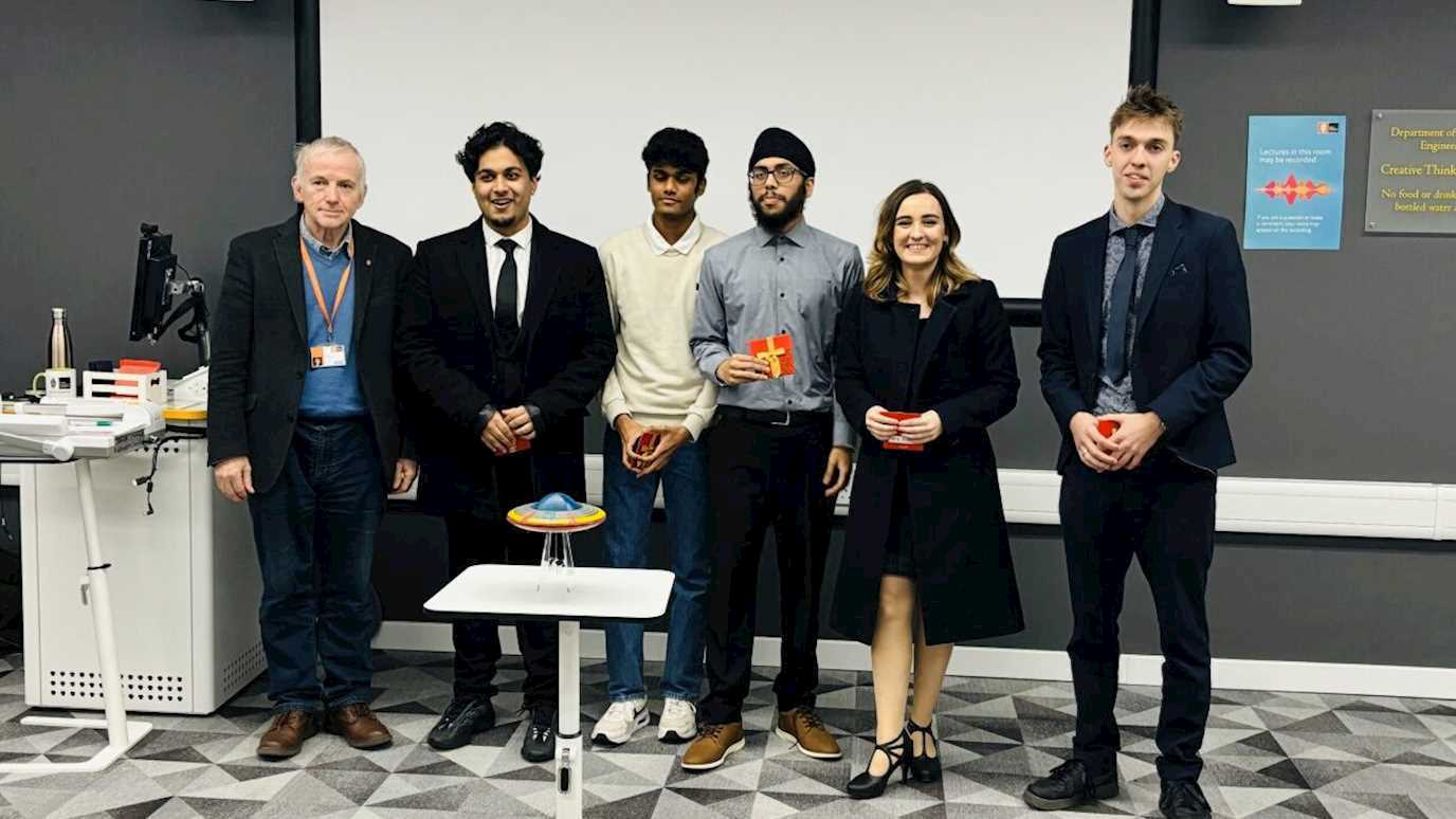 The winning team, who built a UFO design for their baby soother, comprised Ayaan Malik, Hari Arumugam, Sukhman Singh, Naomi Parfitt, Callum Edmonds (pictured above with Professor David Howard).