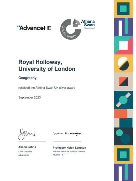 The Department of Geography at Royal Holloway, University of London has achieved the Athena Swan UK Silver Award 2023.