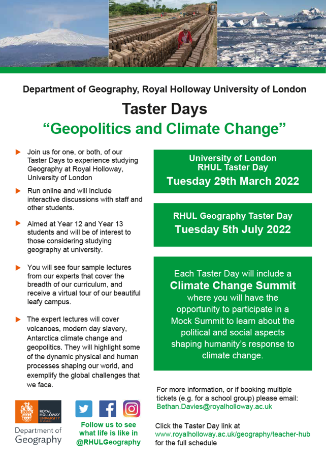 We normally run 2 each term- please join our mailing list by contacting christopher.satow@rhul.ac.uk to hear directly about future dates. Typically a day will include two A-Level relevant teaching sessions, a campus and department tour and a careers session. You will also have an invaluable experience meeting our existing geography degree students!