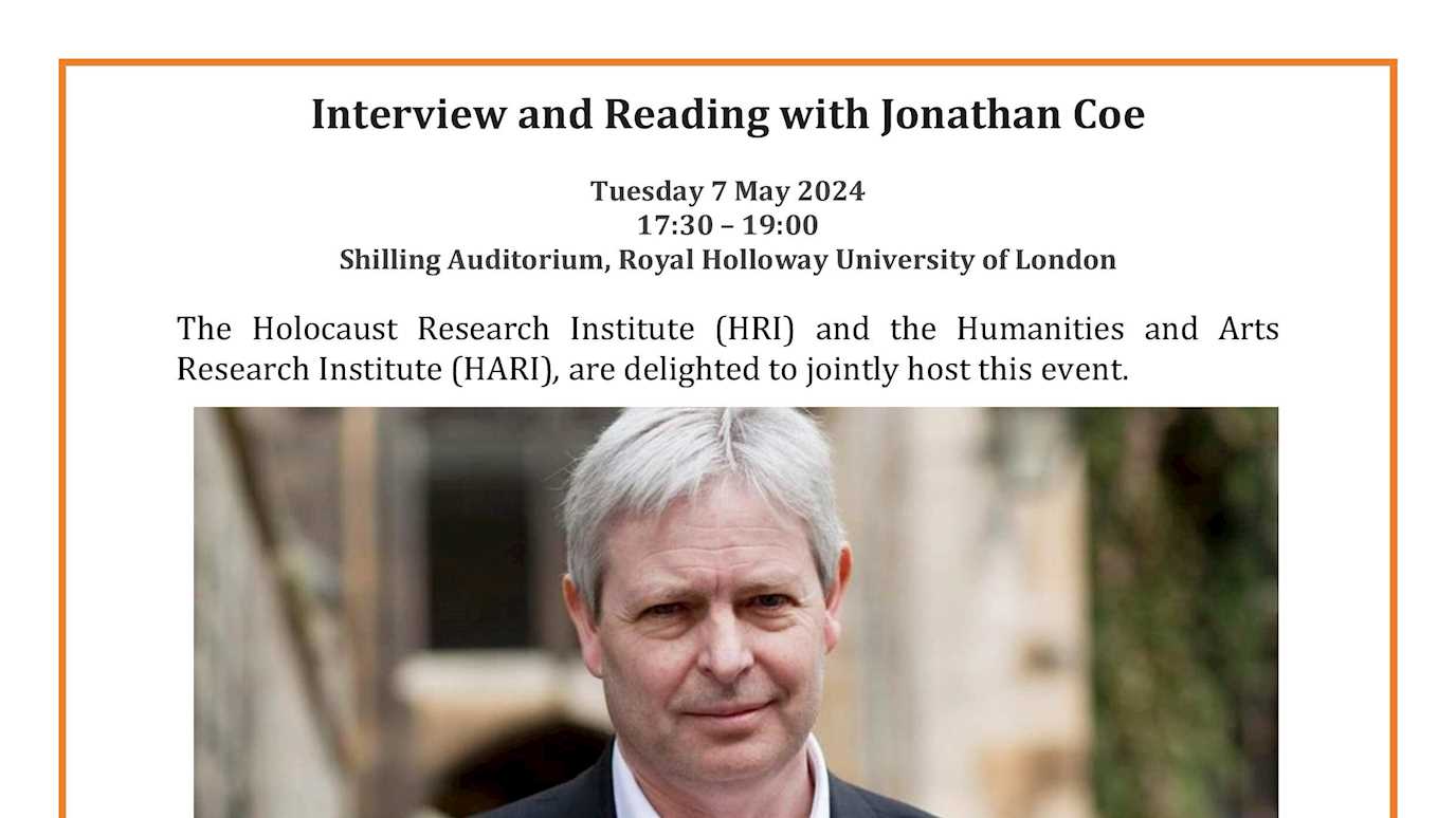 17 Apr 2024Join us on Tuesday 7 May 2024 to listen to Jonathon Coe, in conversation with HRI professors, historian Dan Stone and literary critic Robert Eaglestone, talk about his work.