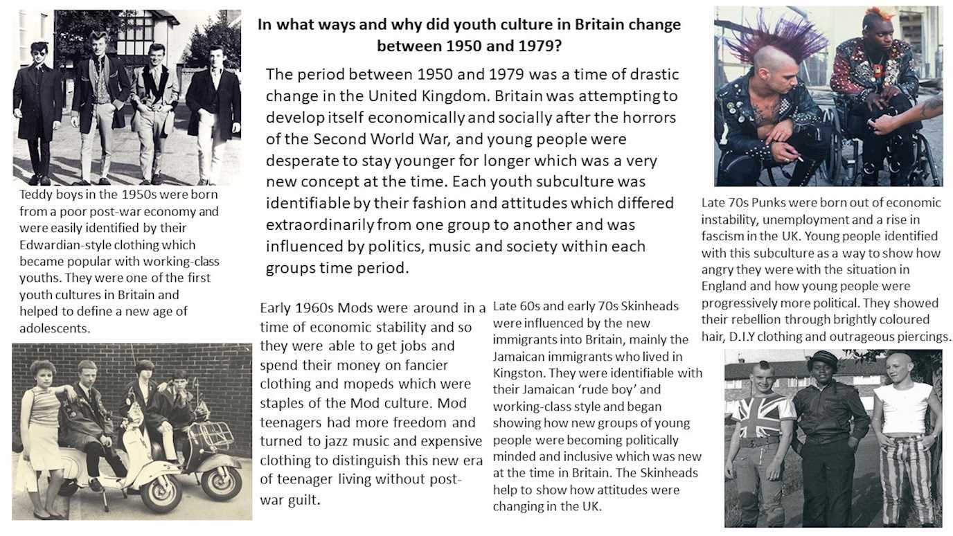 British youth culture has changed drastically over the years to be more inclusive and to highlight and address or even tackle political, social and economic situations within Britain. They show how young people just wanted to be free and be able to stay younger for longer and express themselves in ways that were new to older generations.