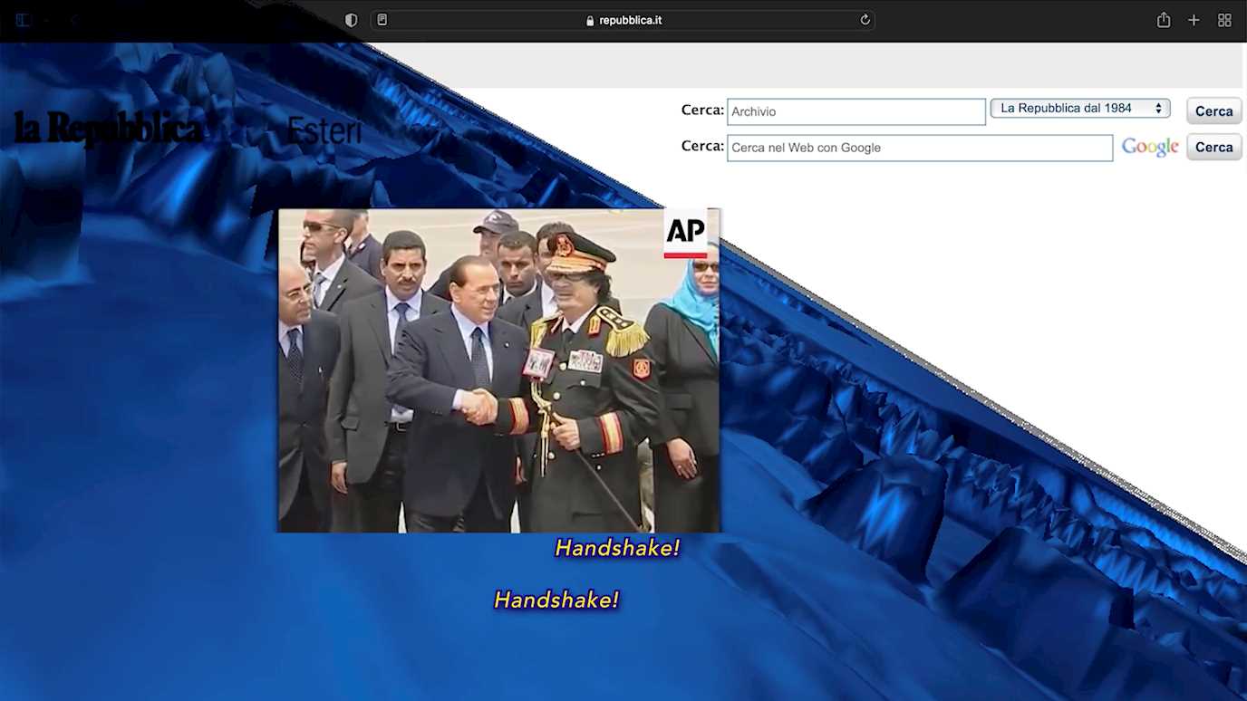Image Credit and Description: Video still from Alessandra Ferrini's Gheddafi in Rome: Notes for a Film, 2022. In the image, a picture of former Libyan leader Muammar Gaddafi shaking former Italian Prime Minister Silvio Berlusconi's hand is superimposed on a blue, computer-generated background.This will be an online event hosted via Microsoft Teams.