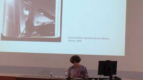 The second day of the conference took place at Università degli Studi ‘La Sapienza’ of Rome and was opened with the keynote speech ‘Expressive Concentrates: Sound in the Visual Poetry of Gerhard Rühm’ in which Nancy Lynn Perloff (Getty Research Institute, Los Angeles) addressed the crucial role of Anton Webern's ‘early pieces reduced to expressive concentrates’ in Gerhard Rühm's minimalist-concrete and visual poetry. The lecture was also performed by some pre-recorded audio excerpts of Gerhard Rühm's poems (Wand/Bild, Stille, Frau/Frau, 1954-1964) recited by Marjorie Perloff (Stanford University), the renowned critic of contemporary, modern, and avant-garde poetry and poetics. The local and global networks of post-World War II visual poetics was at the core of the discussions in the first section of the day and was explored through specific case-studies and key figures of the time, such as the verbovisual agency of Lucia Marcucci by Maria Alicata (Università ‘La Sapienza’) and Jiří Valoch as international redactor for Lotta Poetica by Juliane Debeusscher (LARHRA-Laboratoire de Recherche Historique Rhône-Alpes).