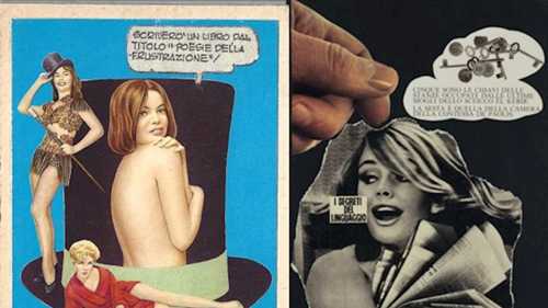 Right: Lamberto Pignotti, Poesie della frustrazione, 1964, collage. Courtesy of the artist. Left: Lucia Marcucci, I segreti del linguaggio, 1970. Courtesy Frittelli Arte Contemporanea – Firenze