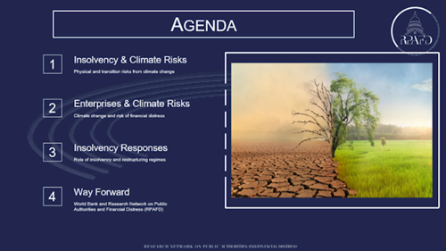 In his presentation (agenda below), Dr Vaccari discussed the preliminary findings of the Worl Bank’s Working Group on insolvency and climate change. He also suggested some measures that national governments could implement to ensure that national insolvency laws and restructuring procedures promote climate mitigation and adaptation strategies.
