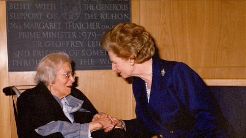 Margaret Thatcher with Dorothy Hodgkin taken at Somerville College, 1991. Photo by kind permission of Somerville College, University of Oxford