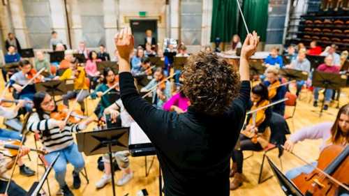 The orchestra is conducted by the College's Director of Orchestras, Rebecca Miller.