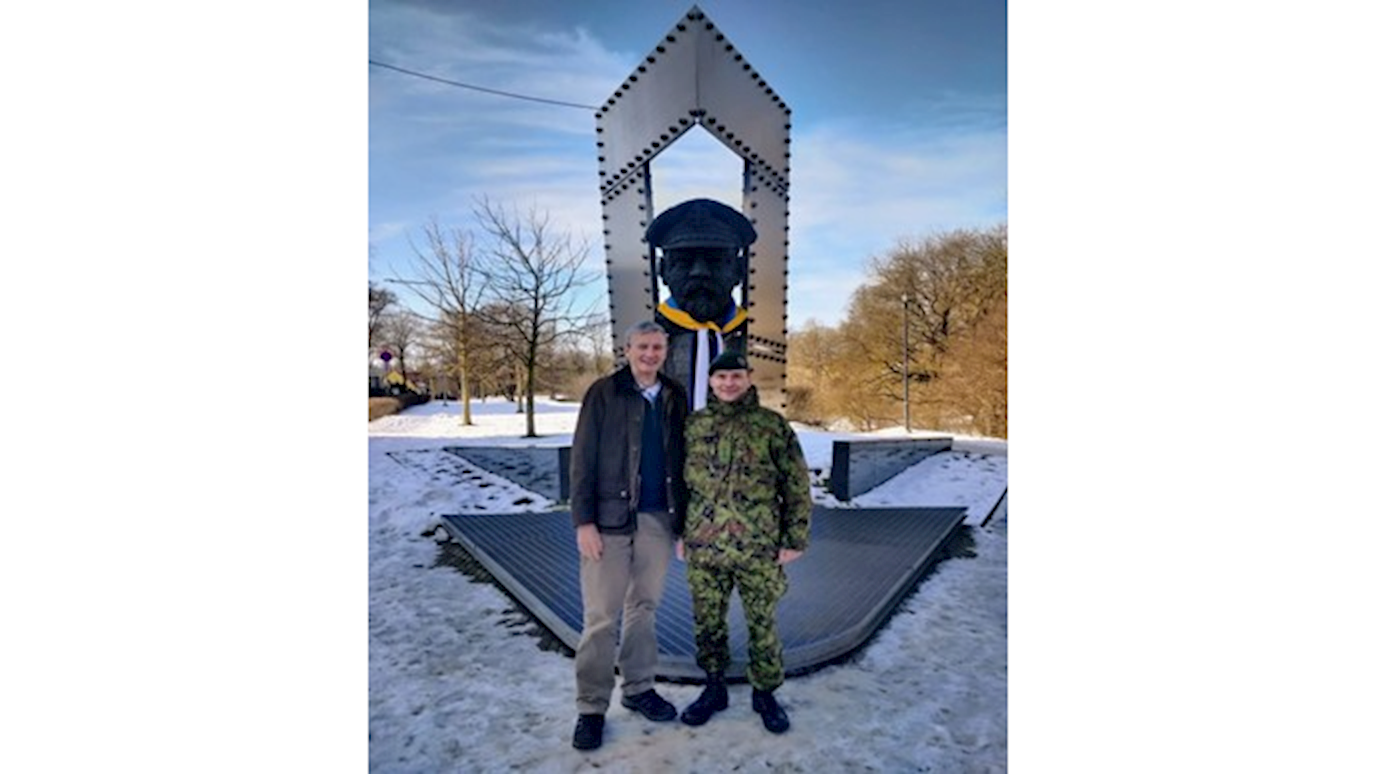 Dr John Tull with Lieutenant-Colonel Tiit Paljak, EDF Lessons-Learned Branch Chief, at the memorial to Johan Pitka, founder of the Estonian Defence League