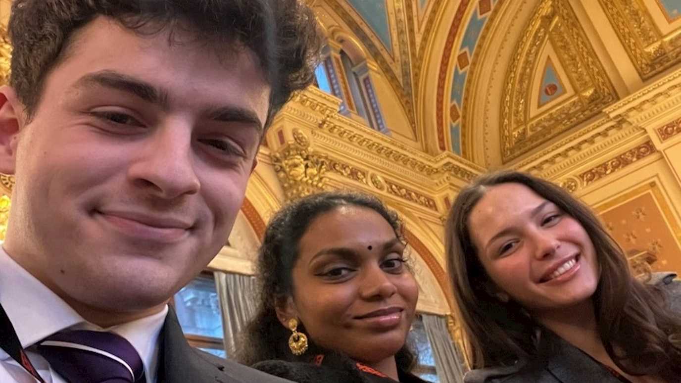Left to right: PIRP students Tom Atmaciyan, Meera Natarajan and Arnisa Ismaili at the FCDO