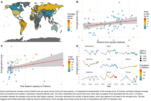 This stunning visualization by Desi delves into sociopolitical, geographic and economic factors that might impact on goals scored at the World Cup. All plots tell their own story, and Desi scraped freely available country-level statistics to complement the World Cup data. The innovative use of faceting allows her overall message to come through while breaking down the core narrative into interesting chunks.