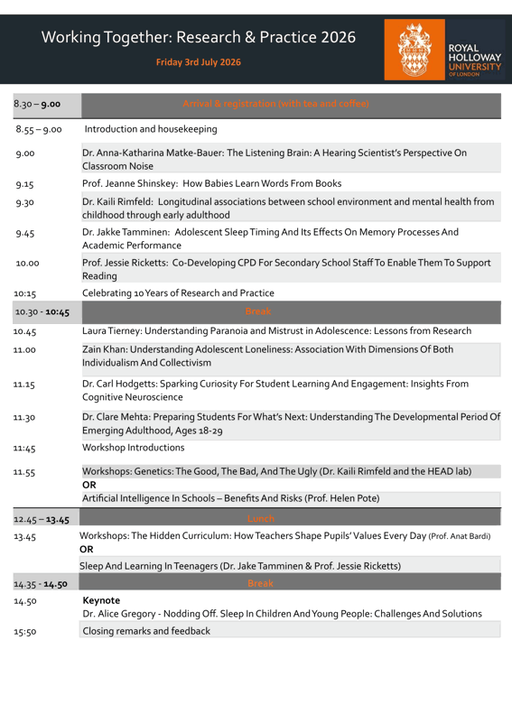 We can now confirm the full schedule for Research and Practice 2026 below. Celebrating 10 years of this collaborative event, the program features a range of talks, a keynote address, and interactive workshops, where researchers and practitioners will discuss critical topics such as reading and vocabulary, AI in the classroom, and the role of sleep in education.