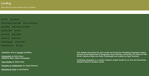 Landing was an exhibition in the Department of Geography at Royal Holloway in 2002 presenting the work of eight partnerships between visual artists and geographers and curated by Ingrid Swenson. This work was undertaken as part of a collaborative research project on Visualising Geography, devised by Felix Driver, Catherine Nash and Kathy Prendergast. An artist book from the project, including the artworks, essays (by Gillian Rose, Ingrid Swenson, Felix, Catherine and Kathy) and documentation from three project workshops with conversations about art, geography, collaboration and practice, was launched at the Royal Geographical Society in 2002. A review by Divia Tolia-Kelly was published in Cultural Geographies. The project was funded by an Arts and Humanities Research Board Innovation Award.